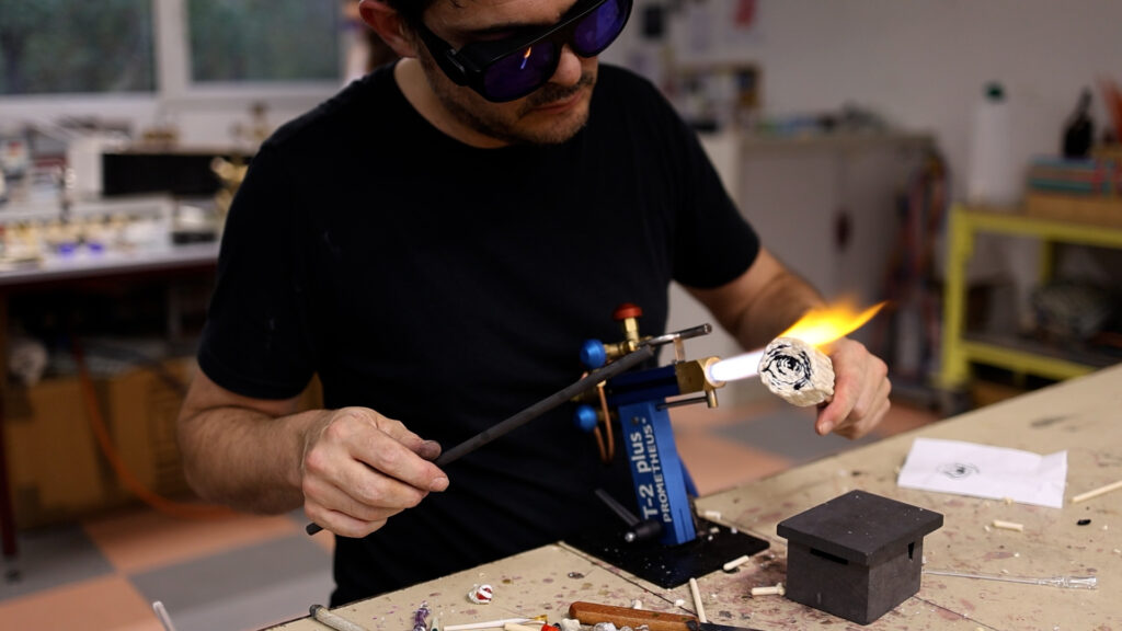 Lors de sa résidence d’artiste au Cerfav fin 2024, Mathieu Grodet a eu l’occasion de nous faire une démonstration de la fabrication d’une canne en verre pour obtenir une murrine. Il a donné une masterclass aux élèves de la formation “Créateur verrier”, option verre au chalumeau, pour transmettre les subtilités de la technique et réaliser sa propre canne en verre, en choisissant un motif de regard. Nous vous proposons d’en découvrir les étapes de réalisation en vidéo !