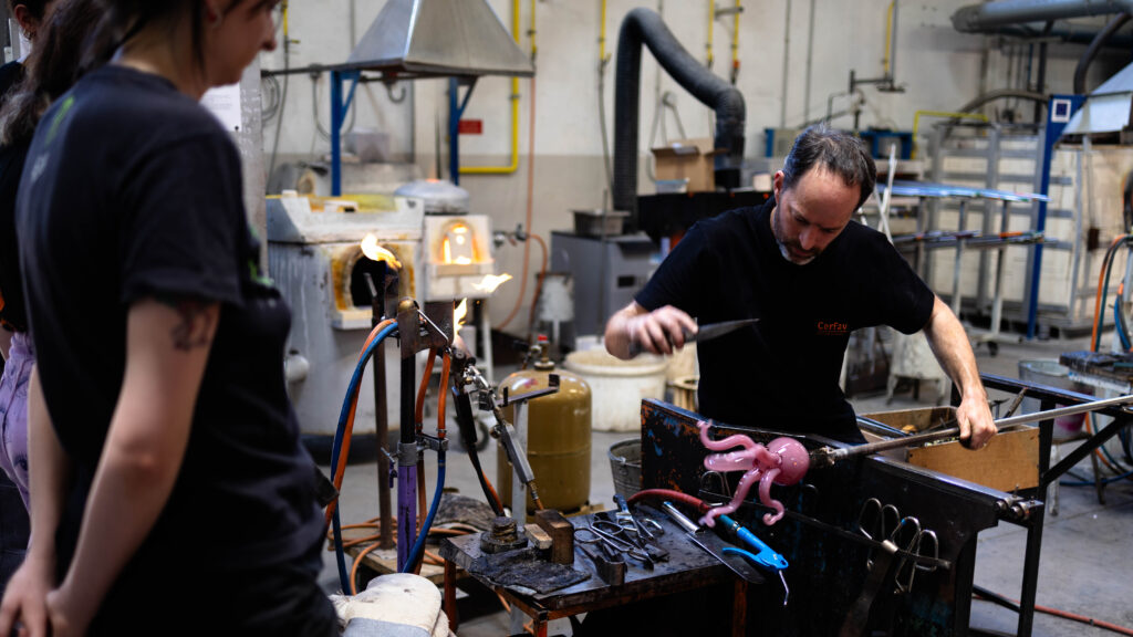 Lors de la venue de Nicolas Laty au Cerfav pour une masterclass donnée aux élèves de la formation « Créateur verrier », Id verre.info a eu l’occasion de filmer la naissance d’un poulpe en verre ! Les techniques de sculpture en soufflage à la canne montrent les possibilités créatives du verre, mais aussi le travail d’une équipe synchronisée pour réaliser l’animal marin.