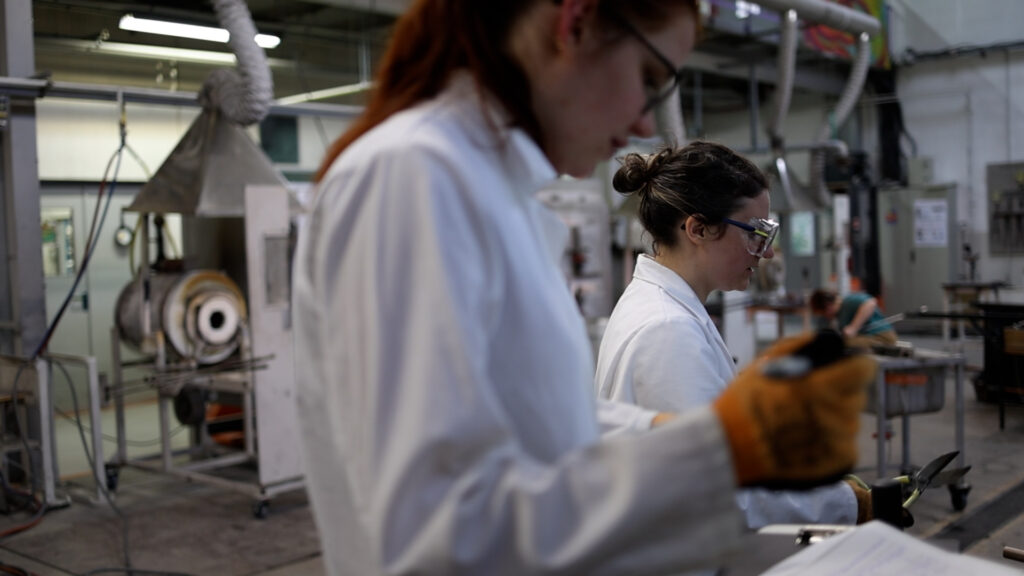 Aujourd’hui, Lucile Cornu, ingénieure R&D, et Sarah Kirsch, chargée de projet R&D, nous font une démonstration de pressage de verre. Le Cerfav est équipé d’une presse qui permet de réaliser des petites et moyennes séries d’objets réguliers à l’aide d’un moule. Qu’est-ce que cela implique en termes de coordination d’équipe, dans les gestes ? Quels résultats peut-on attendre de son utilisation ? À quoi sert-elle précisément ? Quels sont les développements envisagés ?