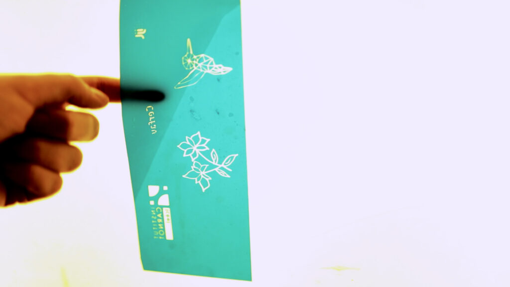 Dans l’ombre de notre studio photo au Cerfav, Ambre prépare des décors. Ils seront apposés sur un film sensible à la lumière, le film photopolymère, qui servira de pochoir pour ensuite réaliser un décor sur une surface en verre par sablage. L’avantage de ce procédé, c’est qu’il permet d’appliquer des décors personnalisés qui répondent parfaitement à la demande d’un client.
